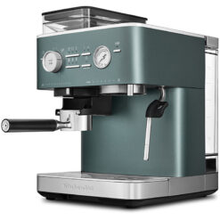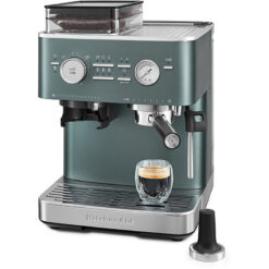 Die KitchenAid ARTISAN Halbautomatische Espressomaschine mit integriertem Mahlwerk (Farbe Juniper) bietet Barista-Funktionen für zuhause. Das konische Mahlwerk erzeugt gleichmäßig gemahlenes Pulver in 15 Mahlgraden, ergänzt durch sieben Feinjustierungen. Die Smart-Dosing-Technologie bestimmt automatisch die ideale Menge für ein oder zwei Tassen; zusätzlich lässt sich die Dosierung manuell anpassen. Bohnenbehälter und Wassertank (2,5 Liter) sind abnehmbar, wodurch Bohnenwechsel und Nachfüllen unkompliziert erfolgen.