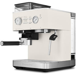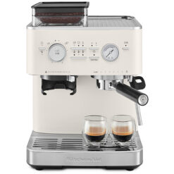 Die KitchenAid ARTISAN Halbautomatische Espressomaschine mit integrierter Mühle in Porcelain White kombiniert Brüh- und Mahltechnik für den Heimgebrauch. Das konische Mahlwerk liefert gleichmäßig gemahlenes Pulver und bietet 15 Mahlgrade sowie sieben Feinjustierungen, um den Mahlgrad individuell anzupassen. Die Smart-Dosing-Technologie bestimmt automatisch die Espresso- oder Doppeldosis, manuelle Feinjustierung bleibt möglich, um verschiedenen Geschmäckern gerecht zu werden. Der 58-mm-Siebträger mit flachem Boden erleichtert gleichmäßiges Tampen und fördert eine stabile Extraktion sowie eine cremige Crema. Die Mehrwinkel-Dampfdüse ermöglicht Milchaufschäumen oder Erhitzen für Latte, Cappuccino und Latte Art. Die Fast-Heating-Technologie bringt Wasser zügig in Betriebstemperatur; Vorinfusion sorgt für gleichmäßige Extraktion. Die Pumpe arbeitet mit 15 bar Druck; Wasserdampf- und Heißwasserspender sind integriert.