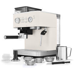 - Lieferumfang: Bohnenbehälter, Wassertank (2,5 L), 58-mm-Siebträger, Tamper, Milchkännchen (355 ml)